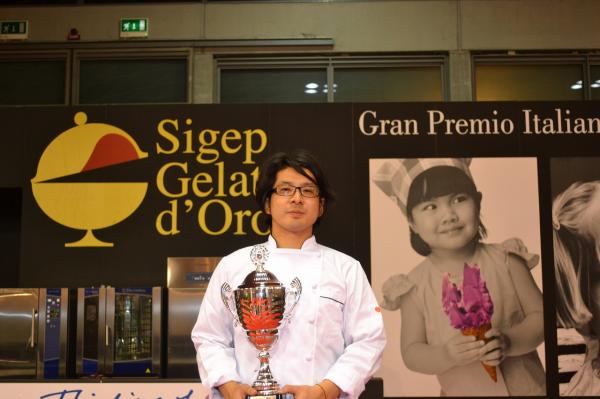 ※写真は【SIN CE RITA(シンチェリータ)】のジェラートマイスター・中井洋輔と受賞作「メルノワ」(蜂蜜と胡桃の意)