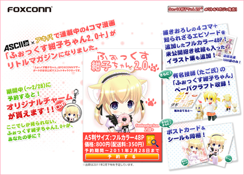 4コマ漫画「ふぉっくす紺子ちゃん2.0+」の作者は永野つかささんです。描きおろしの4コマや知られざるエピソードを追加したA5判サイズ、フルカラー48Pのリトルマガジンです。イラスト集や有名技師たご氏の「ふぉっくす紺子ちゃん」ペーパークラフトも収録しました。 さらにポストカードとシールを同梱いたします。2011年2月28日までに予約をいただくとオリジナルチャームが貰えます。ファン必見の1冊です。