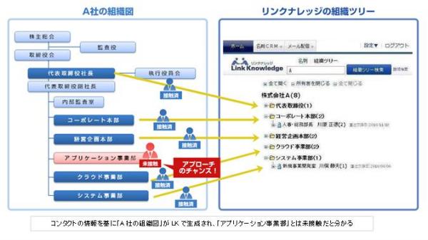名刺情報から自動で生成される組織図と実際の組織図とを照らし合わせることにより、接触したことのない部署を確認し、アプローチの機会を逃さず捉えています。