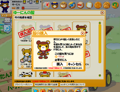課金サービスには現在2種類あり、ゆーにんふぁーむ内に登場するゆーにんというキャラクタ(以下、ゆーにん)の衣装着せ替え、ゲーム内通貨を獲得するための銀行融資があります。ゆーにんの衣装着せ替えに関しては、グラフィックが変わるだけでなく、衣装毎に能力が変化し、ゲームを有利に進めることができます。