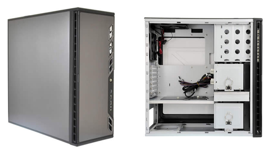 ケースフロントにはダブルヒンジ式のフロントドアを採用しており、270度まで開扉可能です。三層(アルミニウム・プラスチック・アルミニウム)に構成された消音パネルを採用しており、システムノイズを軽減します。