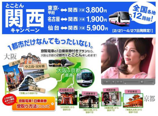 ・対象高速ツアーバス路線と料金:東京⇒関西/4,300円、仙台⇒関西/6,400円、新潟⇒関西/5,000円、金沢⇒関西/3,500円、静岡⇒関西/3,500円、名古屋⇒大阪/2,400円、広島⇒関西/3,700円、愛媛⇒関西/3,700円、福岡⇒関西/4,500円、宮崎・熊本⇒関西/6,000円、長崎・佐賀⇒関西/5,500円、鹿児島・熊本⇒関西/6,000円