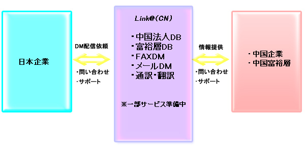 LinkTrustは日本企業から中国市場におけるマーケティング活動の要望があった際に、ASPサービスシステムLink@CN(連動中国)(中国法人データベース・富裕層データベースを保有している)を利用することで、中国市場における顧客開拓等の支援を行って参ります。