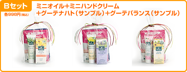 非売品の25周年記念ボトルつきタイプ(Aセット)が3種類、グーテバランスとグーテナハトのサンプルつきタイプ(Bセット)が3種類。全6種類の中から、お好みでどうぞ。