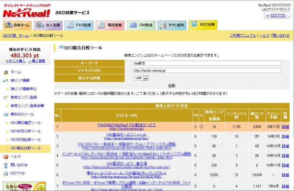 ※以下が実際の会員画面。「FAX配信」キーワードでNetRealFAX配信サービスが1位となっている。調べたいキーワード、URLを入れることで競合サイトのSEO状況がすぐに把握、比較することができる。