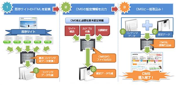 これによりCMS導入時に障害となる既存コンテンツの移行負荷を軽減させ、無駄なコストを抑えたCMS導入を実現させます。
