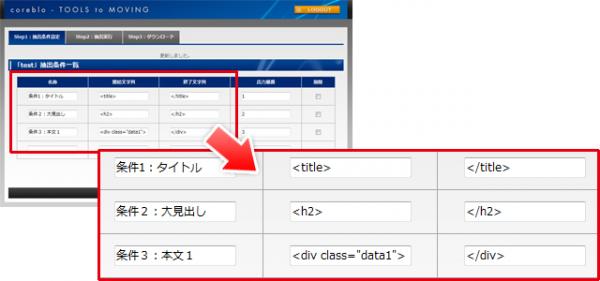 既存サイトからのコンテンツの抜き出しは、HTMLに書かれているタグ、ID名、CLASS名を複数指定可能なので、必要な情報を効率良く抜き出す事ができます。