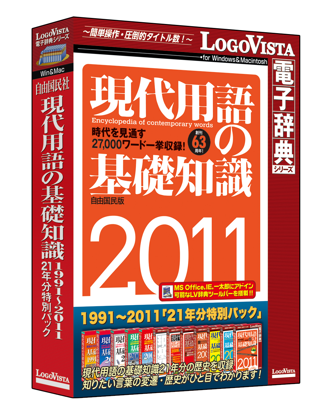 1991年版から2011年版まで合計21年分の『現代用語の基礎知識』をワンパッケージに収録しています。「バブル崩壊」から「サンホセ鉱山落盤事故」、「婚活」まで、流行現象を丸ごと収録。21年分のデータを一度に検索でき、年度ごとに記述の違いをカラーでわかりやすく表示。新語の登場時期や意味づけの変遷などを比較でき、“いま”だけでなく時代の“うつりかわり”もわかります。また50音順ではなく、小ジャンルごとにメニュー検索ができるので、現代を読む事典として、テーマを深く掘り下げ、楽しみながら新しい情報や知識を得られます。