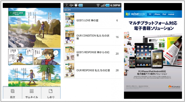 このたび発表された「Wisebook2 for Android」は、PDFやJPEGを電子書籍に変換するだけでAndroid 2.2以降のOSを搭載した各種スマートフォンやタブレットPC端末で閲覧可能になっています。コミック、雑誌、写真集、カタログ、社内文書を即時に電子書籍化することができ快適に閲覧できます。また、必要に応じてハイパーリンク、音声/動画、全文検索等の機能を設定して利用できるようになっています。
