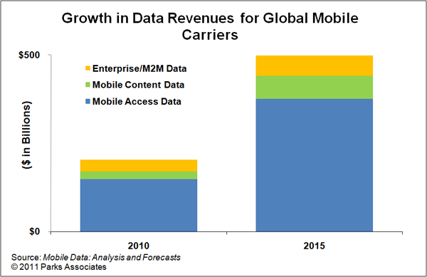 パークスアソシエイツ社の調査レポート「モバイルデータ市場調査:分析と予測 - Mobile Data: Analysis and Forecasts」は、メッセージング、インターネット、アプリケーション、エンターテインメントサービス、M2Mなどのモバイルデータサービスの市場は、2010-2015年に2040億ドルから5000億ドルに成長し、世界のモバイルキャリアの収益を押し上げるだろうと予測している。