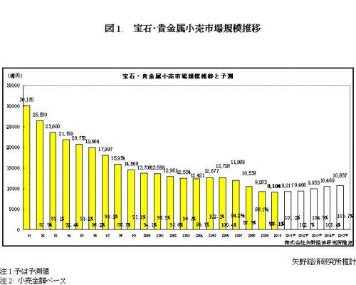 宝飾品小売市場は1991年に3兆円を超える規模となったが、その後落ち込みを続けており、2010年には9,104億円(前年比98.1%)となった。但し1昨年あたりから回復の兆しが見えており、ジュエリー最大の需要期である2010年クリスマス商戦において明確に回復の兆候がでてきた。