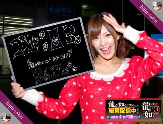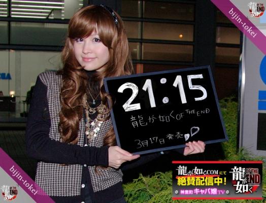 美人が1分ごとに時間を知らせてくれるウェブサイト「美人時計」を運営する株式会社美人時計(本社:東京都港区、代表取締役:田中慎也)は、株式会社セガ(本社:東京都大田区、代表取締役社長COO:臼井興胤)が2011年3月17日に発売を予定しているPlayStation(R)3専用ゲームソフト『龍が如く OF THE END』とのタイアップ企画として、2011/02/25~2011/03/24の美人時計の夜時間帯(21時00分~21時28分)にて、キャバ嬢役7名を登場させ、ゲームの発売をお知らせしていきます。