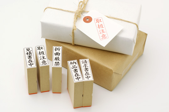 ●「荷物・郵便用5点セット」はネットショップで出荷する商品の袋や、納品書や見積書が入った封筒などに、取扱いの注意や在中を知らせる文言が入ったゴム印のセットです。