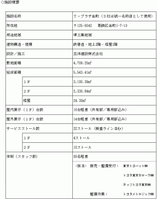 トヨタ自動車(株)の連結会社である、東京トヨペット(株)(港区 社長 古谷 俊男)、トヨタ東京カローラ(株)(目黒区 社長 余郷 勝利)、ネッツトヨタ東京(株)(港区 社長 国田 宏昭)の販売店3社は、このほど、トヨタメトロジック(株)(横浜市 社長 板坂 克則)、トヨタアドミニスタ(株)(港区 社長 板坂 克則)のサポートとともに、都内に合同で併設施設「T-プラザ金町(葛飾区)」を竣工、営業を開始した。