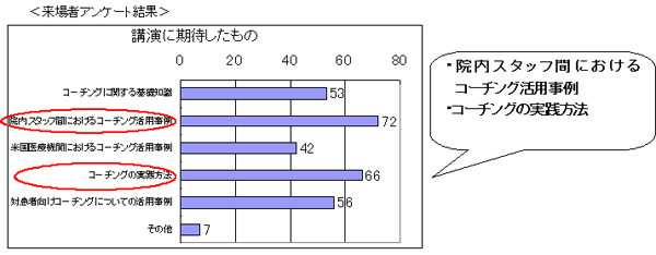 参加者の方からのアンケート結果によると、“院内スタッフ間におけるコーチングの活用”に関心があり、“職員のモチベーション向上”、“組織内マネジメント”や“チーム医療の活性化”といったことに課題をもっている方がもっとも多くという回答が得られました。コーチングや院内のコミュニケーションが、これからの医療業界でより一層重要なキーワードとなっていくことが明らかとなった講演会でした。