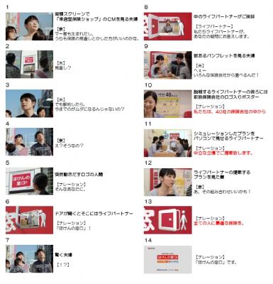 ロケの舞台は、渋谷東口 宮益坂下の実際に看板が掲出され、ひときわ目を引く「ほけんの窓口」のまっ赤な巨大看板前。それを見た夫婦が保険について相談を始めたところ、突然「窓口」の文字が窓のように開き、中からライフパートナーが現れ、窓から実際の店舗にいざなわれた夫婦の相談に乗るといったストーリー展開となっております。去年よりCM契約をしている同看板下の街頭ビジョンでも、同じく3月1日より新CMが放送開始となり、実際に渋谷の同じ場所でこのCMをご覧になられた方は“まるで自分が後ろから映されている”“自分が映っている”ような不思議な体験ができます。