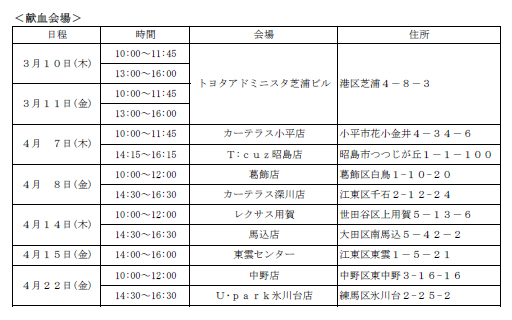 東京トヨペット株式会社(社長 古谷俊男)は、3月10日(木)より4月22日(金)にかけて団体献血を実施する。これは、社員が自主的に参加できる社会貢献活動として、日本赤十字社の血液事業に協力するもの。