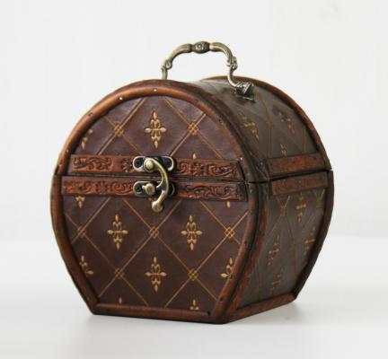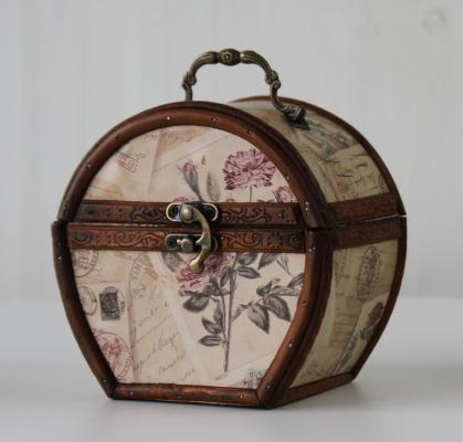 細かな彫刻を施した、金古美仕上げの持ち手付きのコロンとかわいいハンドバッグ型のフラワーボックス。手作りの温もりを感じる木箱にレザー調のPUを丁寧に貼り付けました。