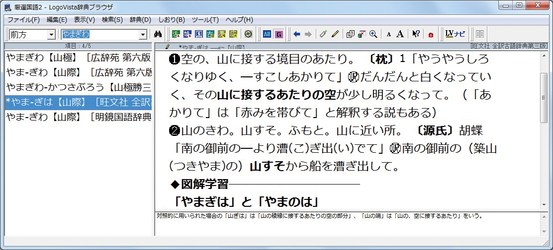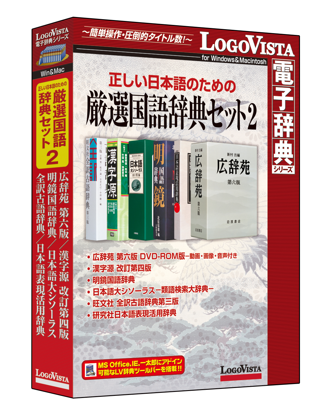 「正しい日本語のための厳選国語辞典セット2」は、国語辞典、類語辞典、日本語活用辞典、漢和辞典、古語辞典と、日本語についてほぼすべての分野を網羅し、著名な6つの辞典を厳選した国語辞典のセットです。百科項目が充実した「広辞苑第六版DVD-ROM 版-動画・画像・音声付き」、正しい言葉の使い方を的確に説明する「明鏡国語辞典」、