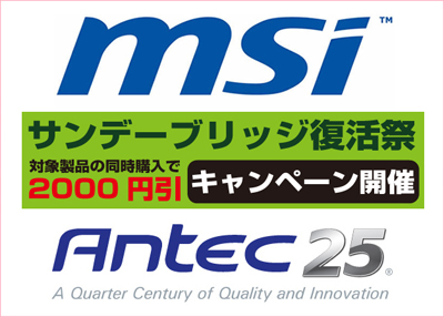 期間中にMSI製のマザーボードとAntec製のPCケースの対象製品を同時購入すると、その場で2000円引きさせていただきます。