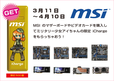 キャンペーン開催期間中に、リンクスインターナショナルの代理店シールが貼られたIntel P67/H67チップセット搭載のMSI製のマザーボード、P67A-GD65 V2、P67A-GD55 V2、P67A-C43 V2、H67MA-E45 V2やNVIDIA GeForce GTX 580/570搭載のMSI製のグラフィックスカードを購入すると、MSI(ミリタリー少女アイちゃん)の限定iChargeを先着500名様にプレゼントします。なくなり次第終了とさせていただきます。