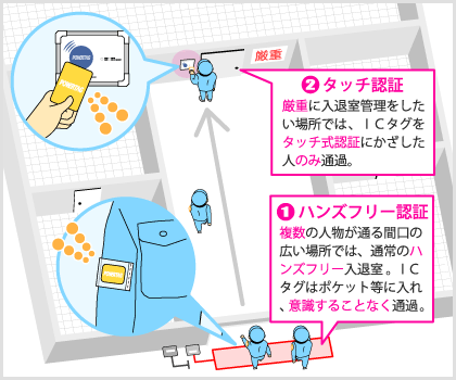 ハンズフリーで複数の人が通過しても認識可能なセミアクティブRFIDシステムを導入している場合でも、「特定の場所は1対1認証でセキュリティを高めたい」という場面が多々あります。そういう場合には、普段はハンズフリーで意識することないICタグを、タッチ認証などで意識する必要があります。そこで、ハンズフリーシステムと同じICタグで利用できるようにセミアクティブタグでのタッチ式認証リーダーの販売を開始しました。