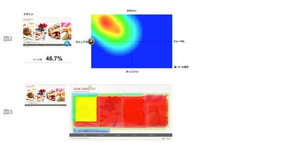 質問と集計にはデザインに特化した機能を搭載しています。デザインの印象を計るために必要な2軸4象限のマトリクスを利用してデザインの方向性を確認する機能(図2)や、デザインの任意のエリアに対して直接良い悪いの評価をした上で意見を書き込む「書き込みマッピング機能」(図3)、など、消費者のデザインに関する定性的な評価が視覚化されるよう工夫されています。