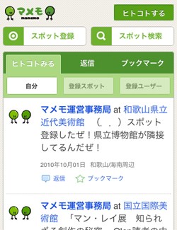 「マメモ」は位置情報連動型のミニブログサービス。PC、携帯3キャリアに加え、今回新たにiPhoneでの閲覧、投稿に対応いたしました。