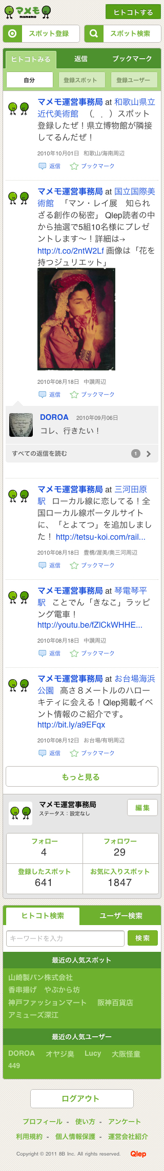株式会社エイト・ビー(本社:神戸市東灘区、代表取締役:諧 秀彦)は、自社が運営する地域情報ポータルサイト「Qlep(キューレップ)」会員向けのサービス「場所でつながるミニブログ マメモ」のiPhone対応サイトをリリースいたしました。