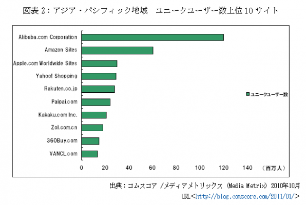 続いて米国発のアマゾンが2位に入っていますが、そのユーザー数は約6千万人と、Alibaba Corporationと大きな開きがあります。(図表2)