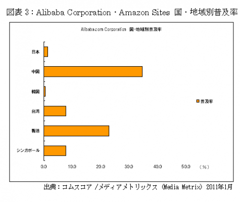 また、Alibaba Corporationとアマゾンの主要な国・地域における普及率を比較すると、Alibaba Corporationは中国本土や香港における普及率が