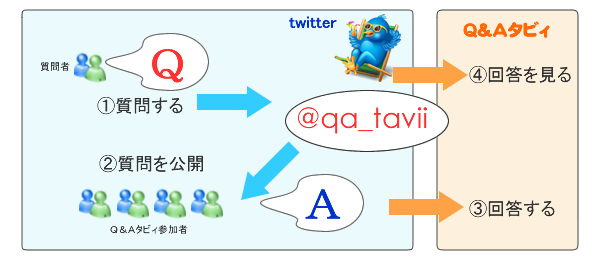 (2)質問してみよう「Q&Aタビィ(@qa_tavii)」に質問をするには、このサイト上から投稿する方法と、Twitter から投稿する方法の2つがあります。