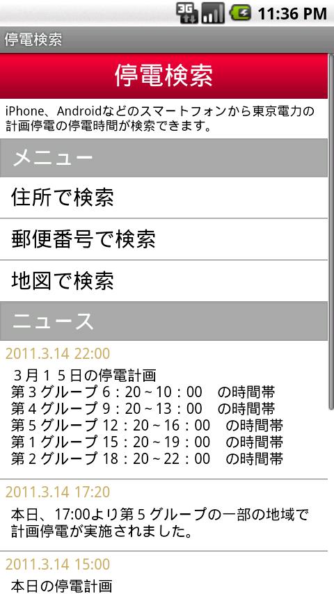 東日本大震災に伴う、東京電力・東北電力の計画停電の停電時間が検索出来ます。