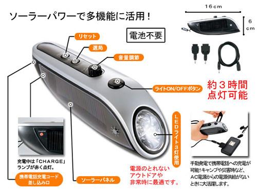 品薄状態が続く防災グッズ。市場では在庫は既にない。そこで予約対応にて販売を開始。その中で、ソーラーライト式で充電が出来、なおかつ手動でも対応可能なライト・ラジオ・携帯充電器が人気です。