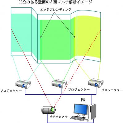 1.民生用カメラを使った簡単な投写面データの解析、映像ブレンディングを速やかに行える。
