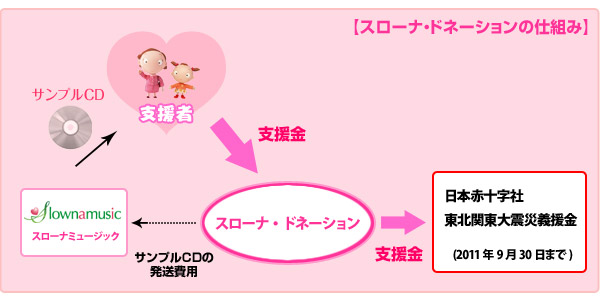 ★「スローナ・ドネーション」では、サンプルCDの発送にかかる費用のみ1件につき300円(送料80円と梱包資材40円およびその他の手数料等180円)を支援金から差し引かせていただきます。予めご了承ください。
