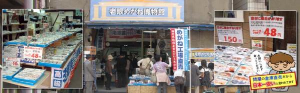 眼鏡卸問屋の倉庫を改装してオープンした「老眼めがね博物館」。老眼鏡48円、遠近両用195円、形状記憶フレ-ム老眼鏡1550円、チタンフレーム老眼鏡2500円など、卸問屋が直売しているため