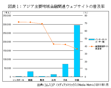 昨今、盛り上がりを見せるアジアの金融市場ですが、アジア主要地域における金融関連サイトのインターネットユーザー数への普及率を比較すると、シンガポール、香港及び韓国で高い結果となりました。これは、シンガポールにおいて国を挙げた戦略で大きく金融市場が成長したことや、香港や韓国での長い間アジアでの金融の中心であったことが背景にあると思われます。そのため、これら3カ国では金融関連ウェブサイトのインターネットユーザーの普及率が約70%に上っています。一方、日本における普及率は約40%と、シンガポールや韓国、香港と比較すると日本のインターネットユーザーは金融関連ウェブサイトへの普及率が比較的低い結果が出ています。(図表1)
