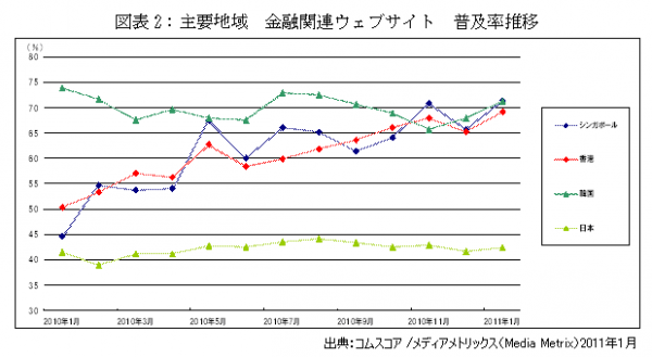また、シンガポール、香港、韓国、日本における2010年1月からの金融関連ウェブサイト来訪ユニークユーザー数の推移を比較すると、韓国と日本においてはユニークユーザー数が横ばいで推移しているのに対して、香港とシンガポールはともにユニークユーザー数を伸ばし、昨年同月比で香港は約140%、シンガポールでは約160%増加しています。(図表2) 2011年1月のコムスコア、メディアメトリックス調べによると、インターネット全体のユニークユーザー数の推移がそれぞれ、シンガポール103%、韓国102%、香港107%、日本103%と各国横ばいである事からもシンガポール、香港における金融関連サイトの高い成長率が伺えます。