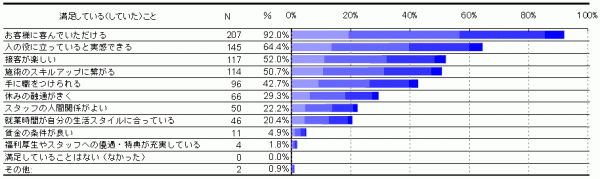 セラピストとして働くうえで満足していることは、「お客様に喜んでいただけること」と回答した人が92.0%、「人の役に立っていると実感できること」と回答した人が64.4%、「接客が楽しい」と回答した人が52.0%という結果になりました(複数回答可)。このことからセラピスト・治療家は、「人のために」という意識の強いホスピタリティーマインドを持った方が多いことがわかります。