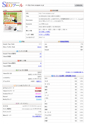 これまでの確かな実績を活かして、SEOのプロが業務で使用するツールの一般提供として開発された「SEOツール」は、自社サイトや競合サイトのURLを入力するだけで、総合チェック・検索順位・キーワード出現率・被リンク元チェック・Whois検索・HTTPヘッダー情報・ページランク偽装チェック・ページランク・リンク切れチェック・IPアドレス確認・発リンクチェック・マップ作成・サイトインデックスチェックなど、SEOの観点から知りたいさまざまな情報を表示します。