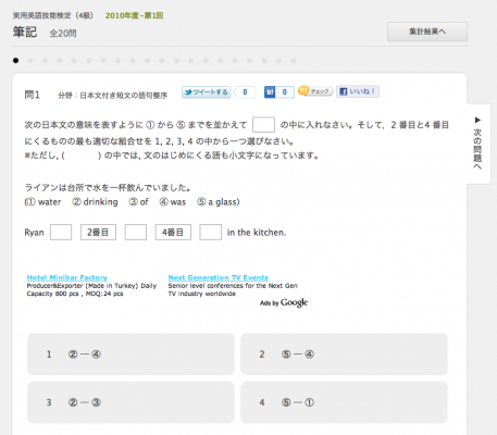 学習結果は、各級ごとに「空所補充」「語句整序」「内容一致」などの分野として纏められ、弱点を分析することができます。