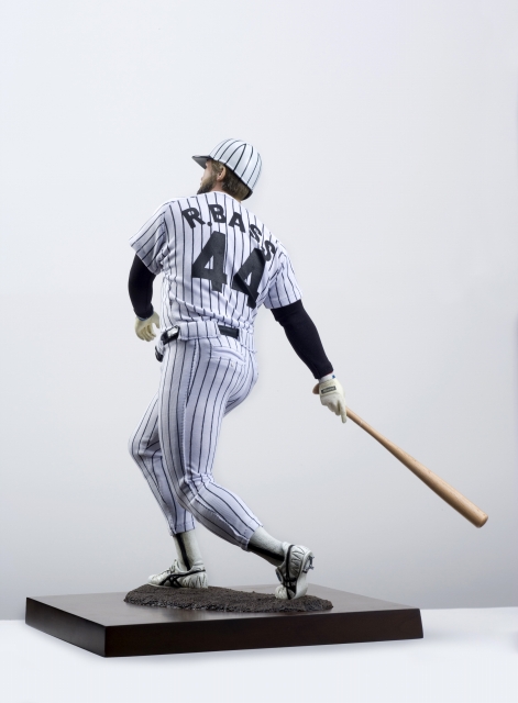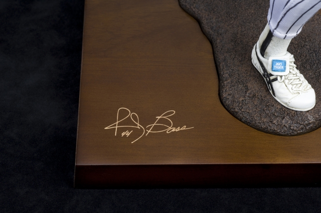 本体はPVC製にて再現され、レプリカミニユニフォームは布製。もちろんユニフォームのボタンサイズやミズノ社製木製のバット、アシックスのスパイクに至るまで徹底的に精密再現。原型制作はENTERBAY社が担当しバース氏完全監修によるリアルフェイスは、まさに生き写しの様相を呈しています。