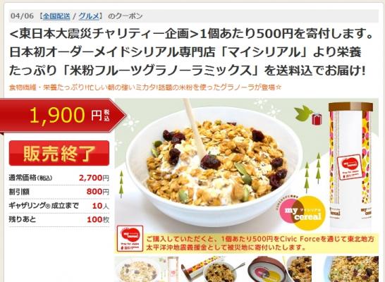 笑屋株式会社(本社:東京都千代田区、代表取締役社長:真田幸次)が運営する『my cereal』(http://www.mycereal.jp/)は東日本大震災チャリティ企画として、国産米粉で製造した「米粉フルーツグラノーラミックス」を義捐金と送料込1,900円で販売致します。ご購入していただくと、1個あたり500円をCivic Forceを通じて東日本大震災寄付金として被災地に寄付致しします。今回、商品のプロモーションとしてディールメート株式会社(本社:東京都品川区 代表取締役社長 佐藤 輝英)が運営する『Qpon』(http://qpon.jp/)にて販売致します。