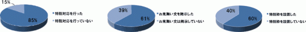 結果、85%のウェブサイトが、通常レイアウトを崩しての情報発信やトップページビジュアルを変更するなど「震災に対し、ウェブサイトで特別な情報発信」を行ったことがわかり、さらに60%以上のウェブサイトが「トップページへのお見舞い文の掲示」「特別枠を設置しての震災関連情報の案内」を行ったことがわかりました。