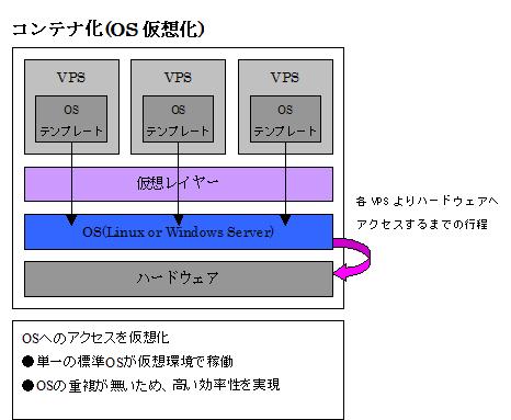 「仮想専用サーバー(VPS)」は、実際に動作している物理的なサーバーの上で、複数の仮想的なサーバーを動作させ、その個々の仮想サーバーを提供するサービスで、完全仮想化、準仮想化、コンテナ化※1などいくつかの種類があります。それぞれ異なる強みがありますが、当社は効率化に強みを発揮する「コンテナ化」の中で、世界的に普及が進んでいる「Virtuozzo」に加えて、商用利用の実績がまだ少ないが、Unixシステムの性能を評価するプログラム(UnixBench)で、同じシステムで30%処理能力が高い※2ことが検証された「Linux Container(LXC)」を世界に先駆けてサービス提供することで、「仮想専用サーバー(VPS)」の幅広いニーズに対応いたします。