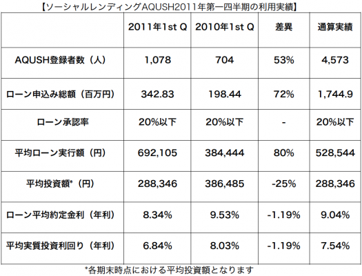 ソーシャルレンディングサービスAQUSH(アクシュ、www.aqush.jp)を運営する株式会社エクスチェンジコーポレーション(東京都千代田区、代表取締役社長:ラッセル・カマー、以下「ExCo(エクスコ)」)は、本日、2011年第一四半期(2011年1月~3月)のAQUSH利用実績を発表しました。