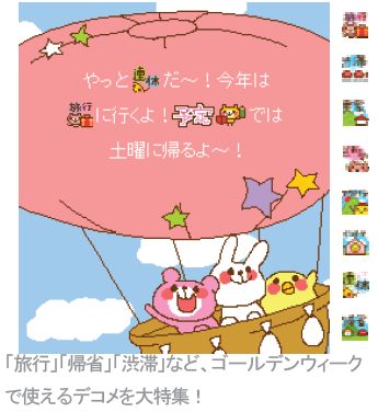 コンテンツ内容:「旅行」「帰省」「渋滞」など、ゴールデンウィークで使えるデコメを大特集!