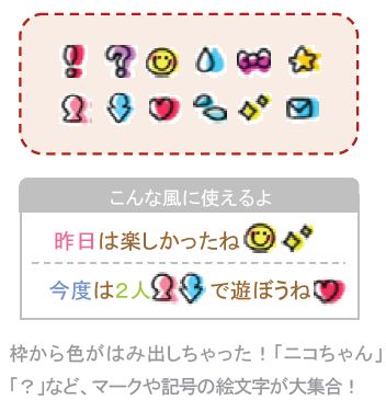 コンテンツ内容:枠から色がはみ出しちゃった!「ニコちゃん」「?」など、マークや記号の絵文字が大集合!