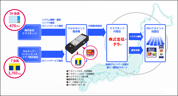 株式会社テラ(本社:神奈川県横浜市、代表取締役:山崎竜司、以下「テラ」)が共通ポイント事業において提携している株式会社クラブネッツ(本社:東京都渋谷区、代表取締役社長:冨安 仁、以下「クラブネッツ」) は、2011年4月18日、カルチュア・コンビニエンス・クラブ株式会社(東京本社:東京都渋谷区、代表取締役社長兼CEO:増田 宗昭、以下「CCC」)と包括的な代理店契約の締結により、「Tポイント」の拡販をCCCと合同で推進することについて発表を行いました。この契約締結に伴い、クラブネッツと提携関係にあるテラは、クラブネッツのCNポイントとTポイントの2ブランドを同時に取り扱う新たなポイントの形として「CN×Tポイント販促パッケージ」の販売を開始すると共に、首都圏エリアにおける同パッケージの運用を4月度よりスタートすることとなりましたのでご案内申し上げます。